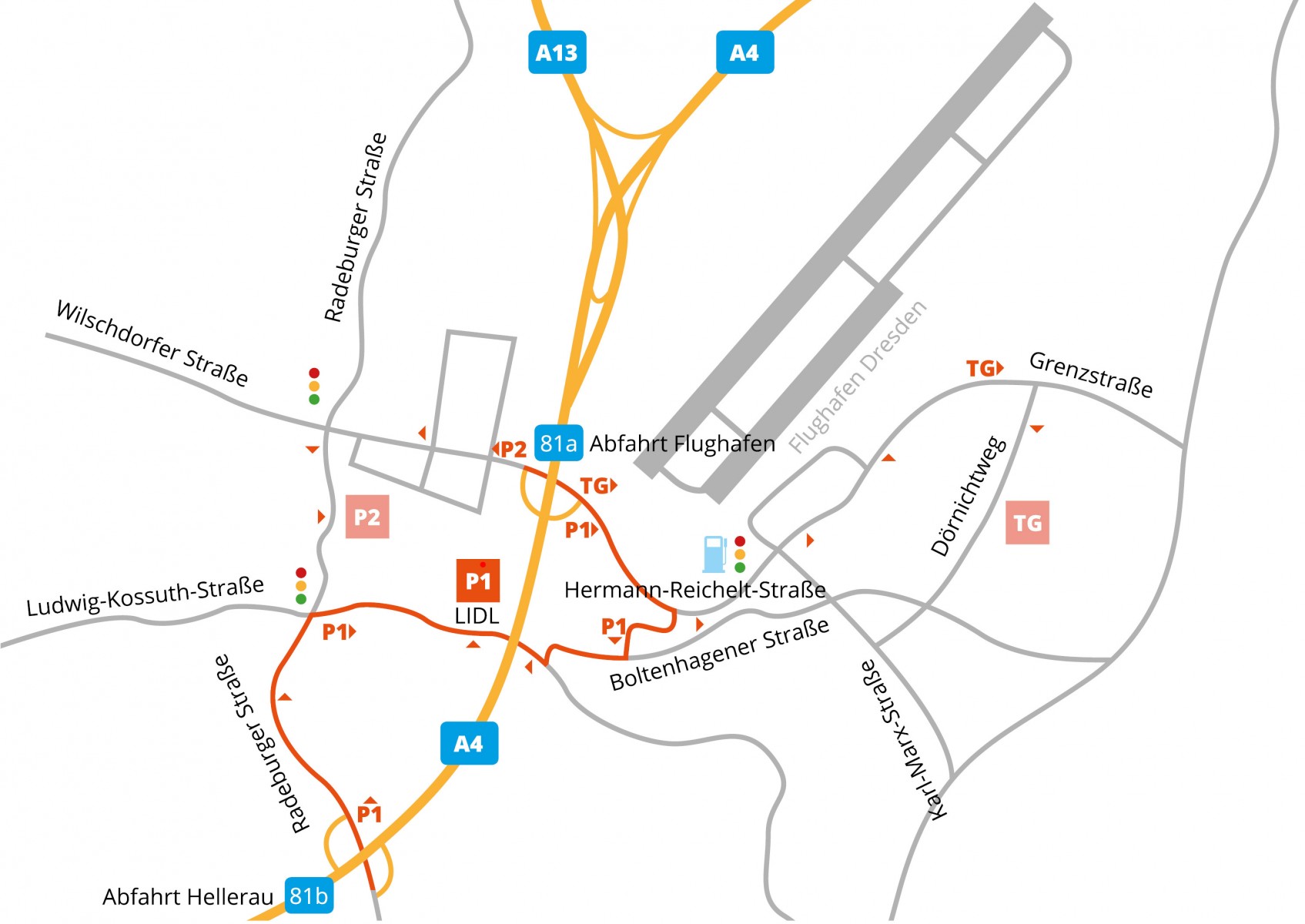 Leicht zu finden: Unser Flughafen Parkplatz P1 befindet sich in unmittlebarer Nähe zu der Autobahnabfahrt Dresden Flughafen und ist so ganz bequem, ohne Stau, Verkehrschaos oder Umweltzonen zu erreichen. Eine detaillierte Anfahrtsbeschreibung erhält jeder Kunde mit der Buchungsbestätigung. P1 Parkplatz Anschrift: Ludwig-Kossuth-Straße 49, 01109 Dresden